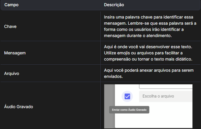 Na parte inferior do painel de Mensagens Rápidas, você pode visualizar as seguintes informações: Chave, Mensagem, Arquivo e Áudio Gravado.