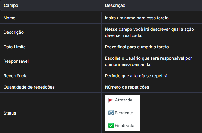 As tarefas são uma forma de organizar o dia-a-dia dos colaboradores. Assim, é possível que eles criem uma rotina de atividades, categorizando-as por prioridade, data limite de realização, usuário responsável, etc.