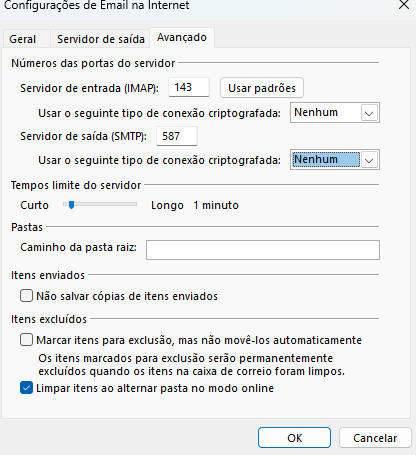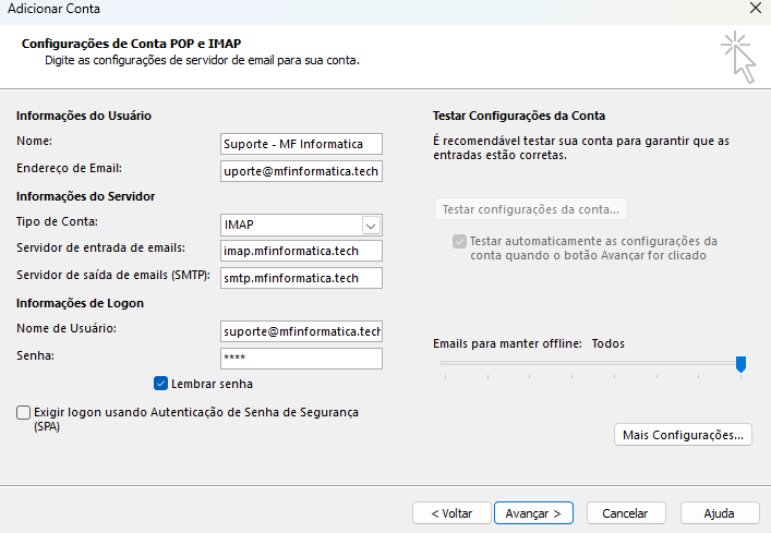 Se precisar alterar as configurações IMAP, Somente ir em Mais Configurações, e realiza as alterações que necessita: