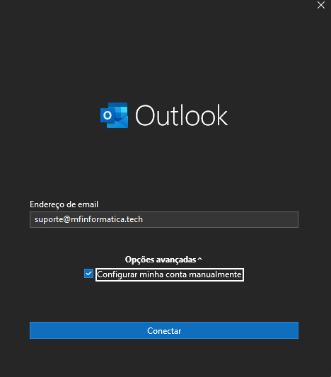 Em primeiro lugar, preencha seu e-mail completo e clique em Opções avançadas. Posteriormente, marque a opção, configurar minha conta manualmente e clique em Conectar.