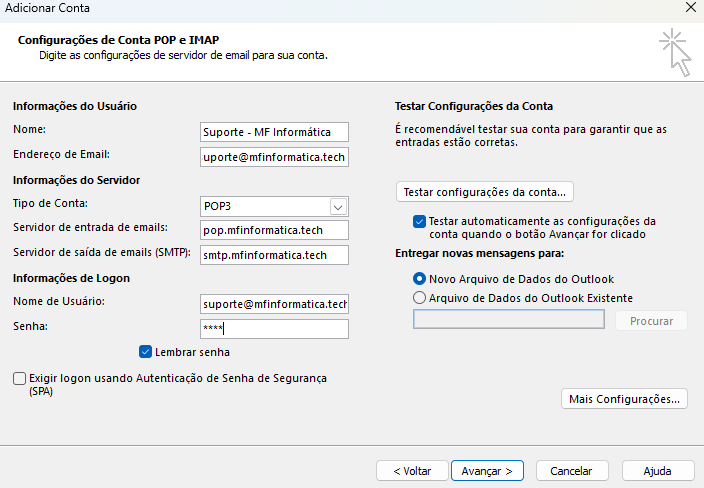Após clicar em Avançar, ele irá realizar um teste de e-mail para ver se as informações que foram colocadas estão corretas se estiver correto, ele irá criar o seu e-mail e ele irá funcionar perfeitamente, se tiver alguma informação incorreta ele já irá apresentar o erro e aí tem que verificar novamente se não tem algo errado.
