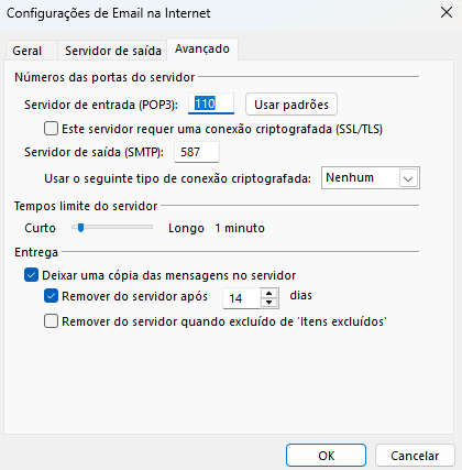 Posteriormente, serão solicitados os servidores de entrada/saída de e-mails, além das portas de comunicação. Preencha: