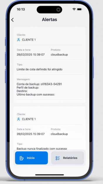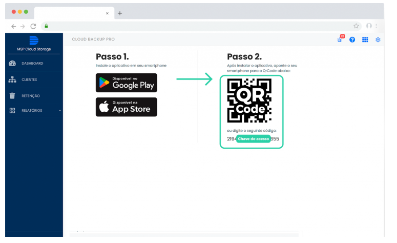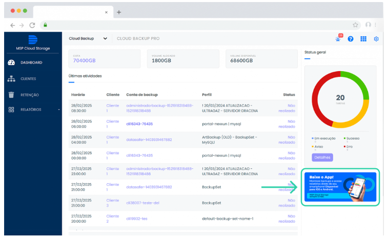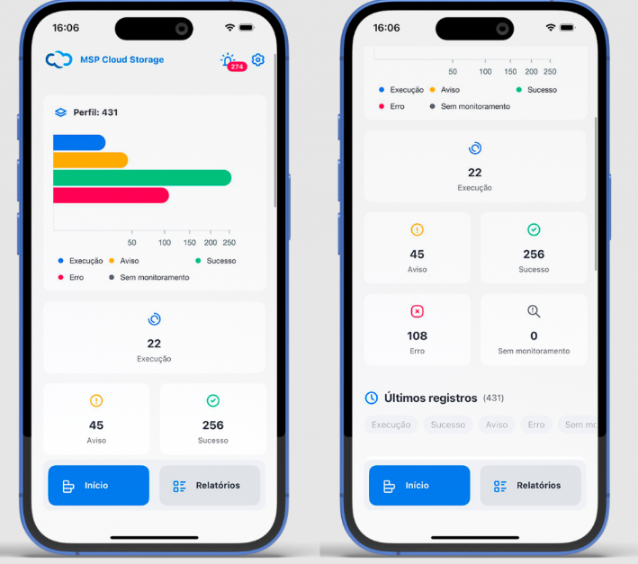 A nova versão do MSP Cloud Storage é um aplicativo de gerenciamento e monitoramento de backups disponível para Android e iOS. A plataforma oferece controle total sobre as operações de backup, permitindo a visualização de relatórios detalhados, execução remota de tarefas e recebimento de alertas de falhas em tempo real.