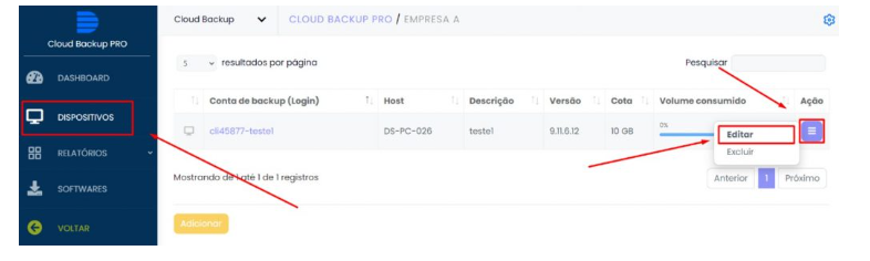 Passo 3: Clique na guia “Dispositivos”, e após localizar o dispositivo (conta de backup) desejado e clique em “Ação” e “Editar”: