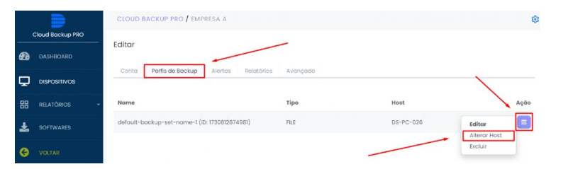 Passo 4: Na próxima tela, clique na aba “Perfis de Backup” e nas opções “Ação” > “Alterar Host”: