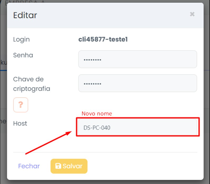 Passo 5: Insira a senha da conta e a chave de criptografia (se houver) e por fim, coloque o novo nome da máquina em “Host” e clique em “Salvar”: