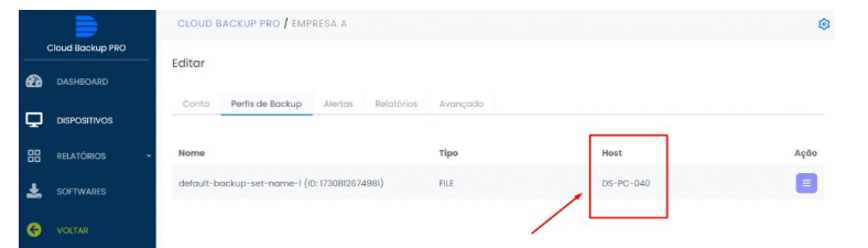 Passo 6: Confira se o novo nome da máquina (hostname) foi alterado e Repita a ação dos passos 4 e 5 em todos os perfis desta conta de backup.