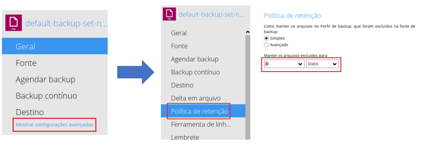 Selecione o perfil que deseja fazer a alteração, em seguida clique em “Mostrar configurações avançadas”, depois em “Política de retenção”, escolha uma das opções ou inclua manualmente o valor desejado, para a nova política de retenção e clique em “Salvar”.