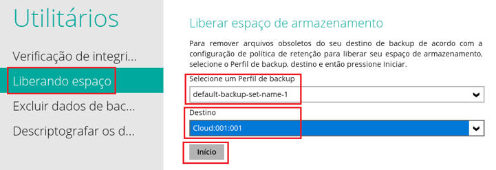 Em seguida clique em “Liberando espaço”, selecione o perfil e o destino desejados, por fim, clique em “Início”.