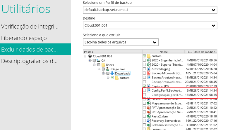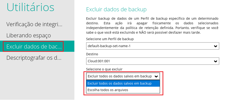 Em seguida, clique em “Excluir dados de backup”, depois selecione o perfil e destino onde deseja fazer a limpeza. Por fim, que tipo de exclusão deseja fazer. Caso opte pela opção “Excluir todos os dados salvos em backup”, a rotina será totalmente eliminada, excluindo todos os dados, tanto da nuvem como da área ativa. Caso seja essa a ação desejada, selecione-a e clique em “Excluir”.