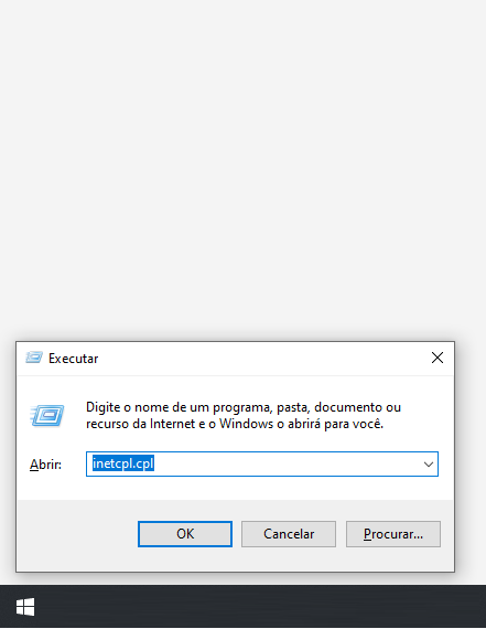 Para ajustar é necessário configurar nas opções da Internet. Aperte, juntas, as teclas “Windows + r” e digite inetcpl.cpl, pressione “Enter”.