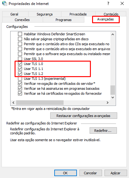 Será aberta a tela “Propriedades de Internet”, vá até a guia “Avançadas” e certifique que as opções de Usar TLS, estão marcadas. Conforme imagem abaixo.