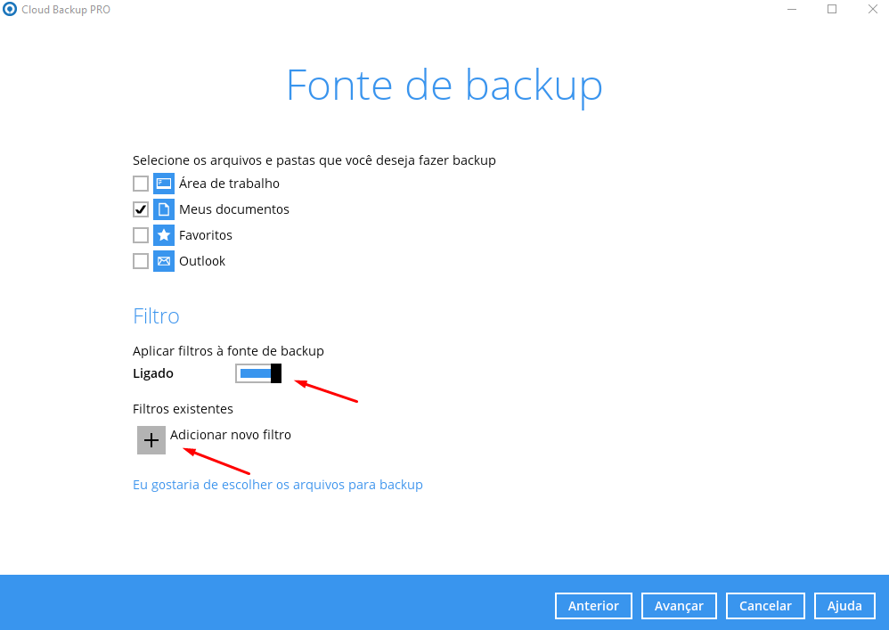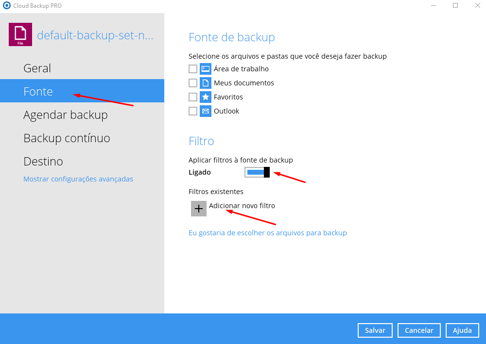 Na criação de um novo perfil de backup, ao exibir a opção “Fonte de backup”, no campo “Filtro” clique em “Ligado” e em seguida em “Adicionar um novo filtro”.