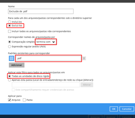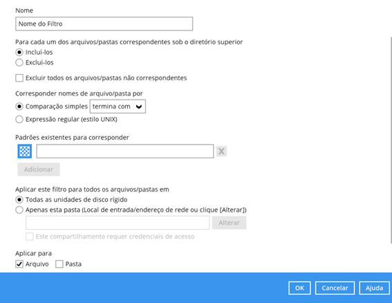 · Corresponder nos de arquivo/pasta por: Neste campo, você poderá utilizar uma comparação simples (como “termina com”) ou expressões regulares (para padrões mais complexos) para identificar quais arquivos ou pastas serão filtrados;
