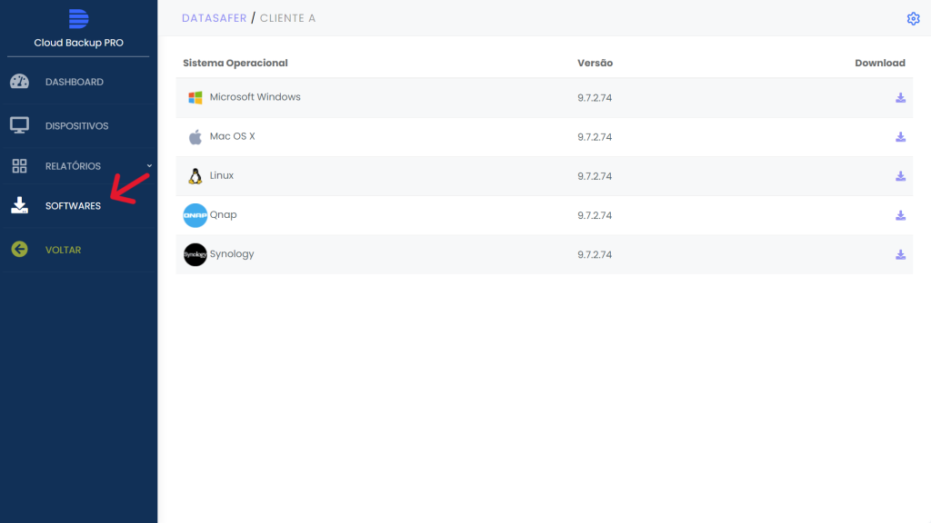 Em seguida clique no meu lateral “SOFTWARES” e escolha o instalador de acordo com seu sistema operacional.