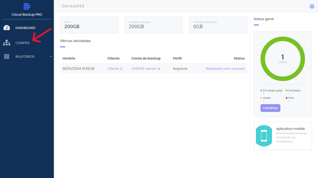 Após acessar o portal com seu usuário e senha, clique no meu lateral “CLIENTES”.