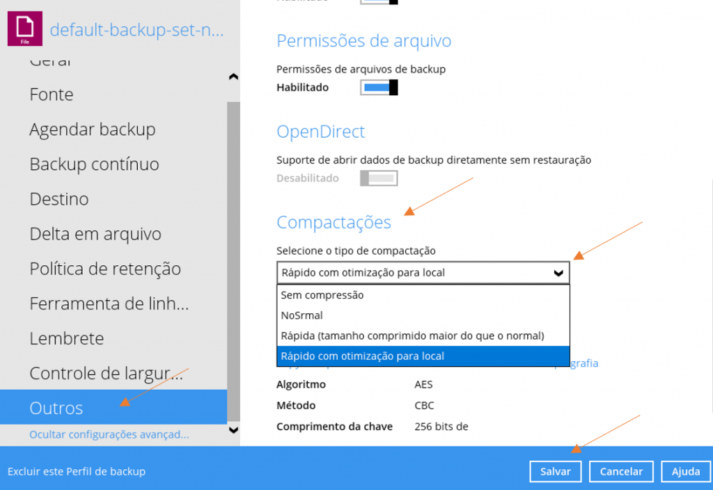 Por padrão a ferramenta vem com a opção “Rápido com otimização para local”, essa opção faz a compactação do backup em nuvem de forma normal (padrão), mas para os backups locais faz uma compactação menor, a fim de realizar um backup mais rápido.