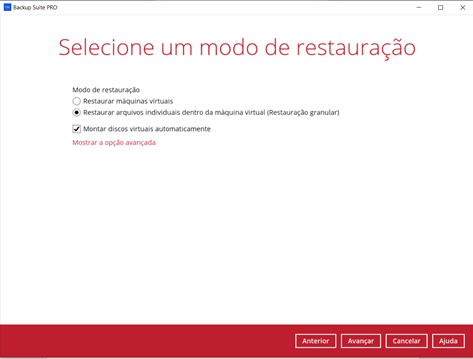 Passo 4: Selecione a opção “Restaurar arquivos individuais dentro da máquina virtual”. Selecione a opções “Montar discos Virtuais automaticamente”.