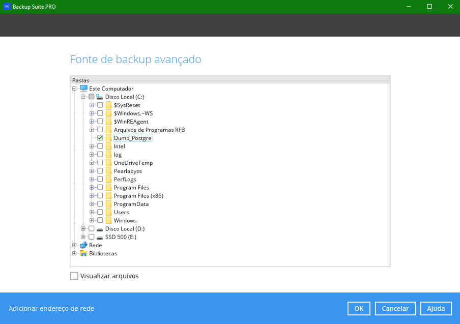 5. Clique em “Eu gostaria de escolher os arquivos para backup”. Em nosso exemplo, o script de pré comando vai salvar o dump na pasta C:\Dump_Postgre.