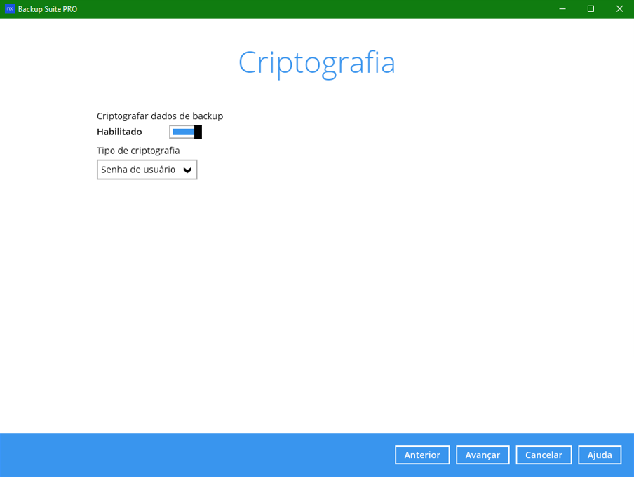 9. Defina a chave de criptografia para a rotina. Caso selecione “Senha do usuário”, será configurado a mesma senha da conta de backup.