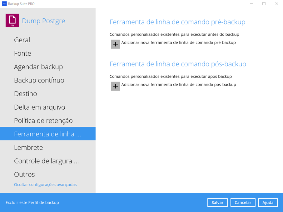 15. Adicione nova ferramenta de linha de comando pré-backup. Identifique um nome, selecione o diretório onde foi salvo o script e escreva o nome do comando.
