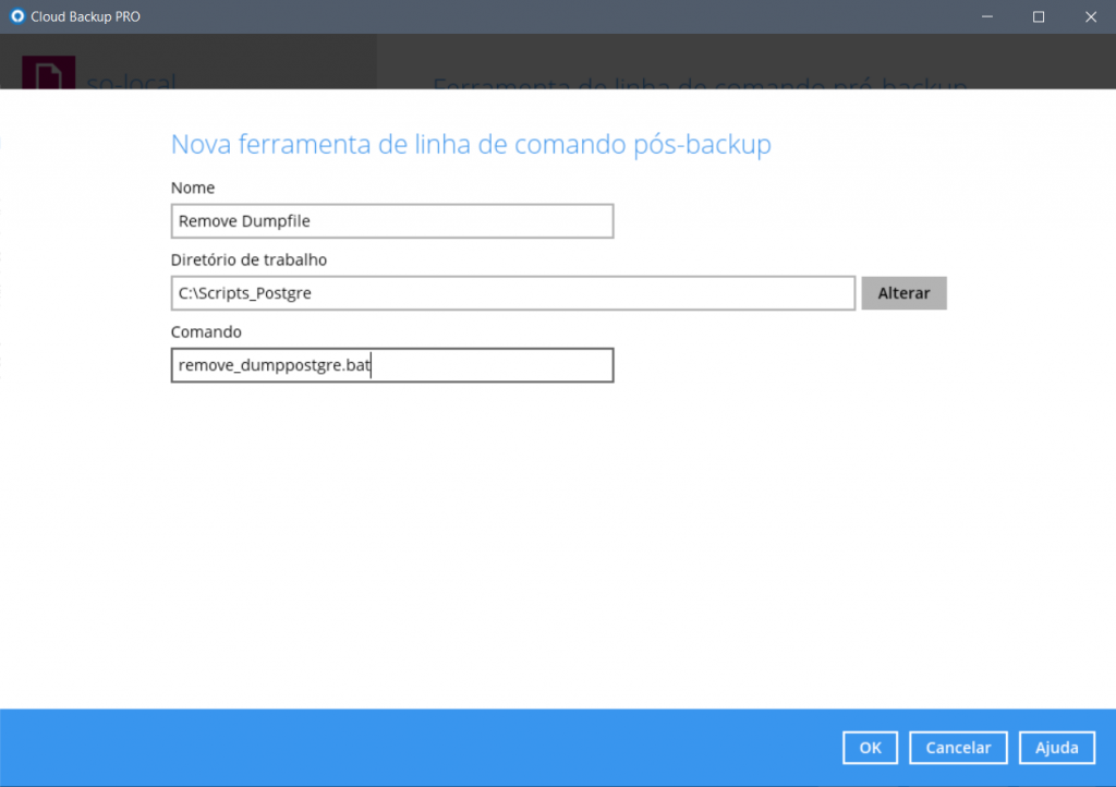 16. Adicione nova ferramenta de linha de comando pós-backup. Identifique um nome, selecione o diretório onde foi salvo o script (arquivo remove…) e escreva o nome do comando. Por fim, clique em “Ok”.