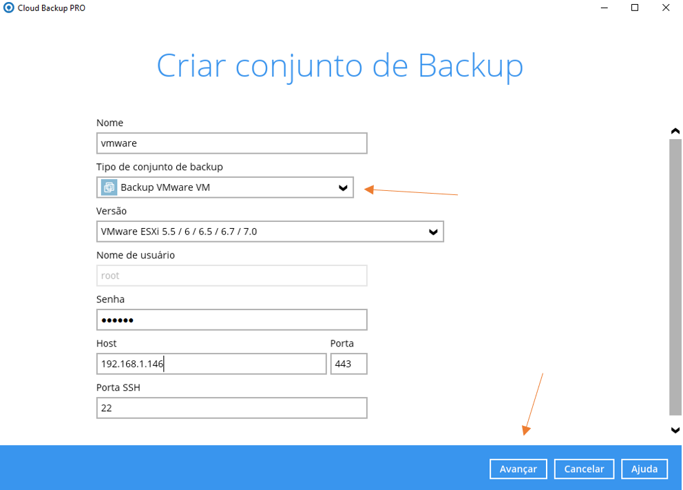 Passo 4: Na tela seguinte, selecione em “Tipo de conjunto de backup”, a opção “Backup VMware VM” e em seguida aparecerá novas informações que devem ser preenchidas conforme versão e configurações no VMWare e clique em “Avançar”: