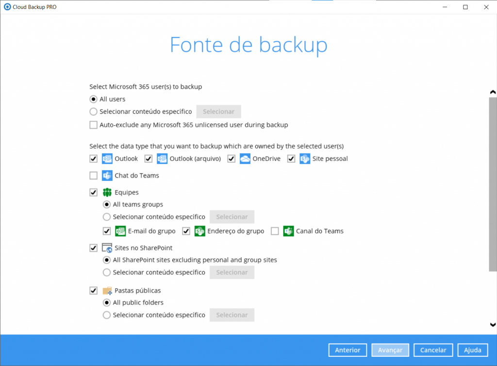 Após o teste ser concluído com sucesso, avance e selecione os itens que de seu Microsoft 365 para o processo de backup: