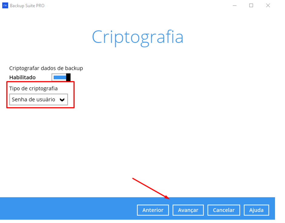 Configure a chave de criptografia (recomendado utilizar a opção “senha do usuário”), clique em avançar.