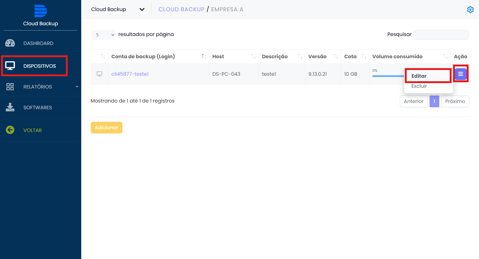 1 – Acesse a conta de backup onde o MySQL será configurado. Clique no menu com as três listras, em seguida clique em “Editar”: