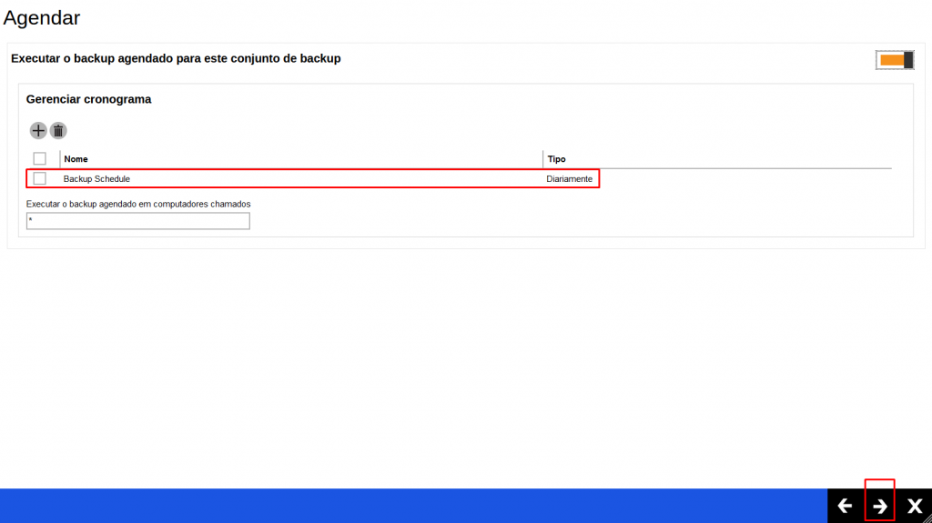 9 – A configuração vem com o agendamento diário configurado, neste agendamento é possível alterar apenas o horário. Caso queira realizar um agendamento diferente, exclua-o e clique na opção de adicionar: