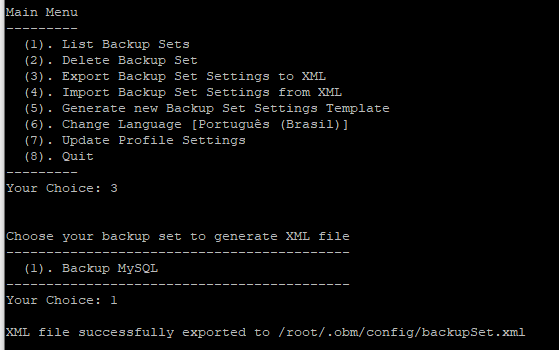 17 – Após gerar o arquivo backupset.xml, saia da ferramenta (opção 8) e edite o arquivo gerado para colocar a senha do banco.