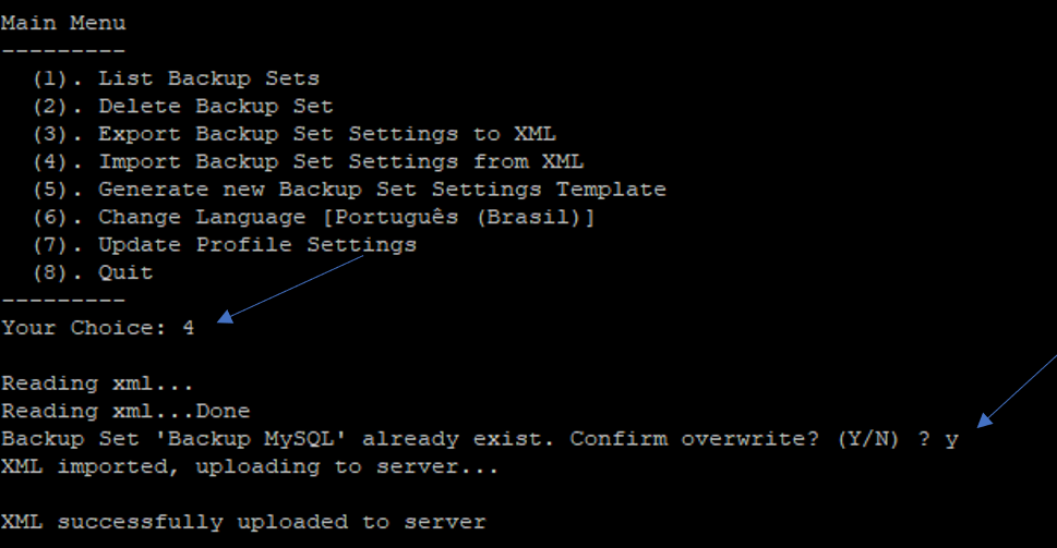 19 – Faça o login novamente na ferramenta e selecione a opção “4” para importar o arquivo backupset.xml com a senha do banco:
