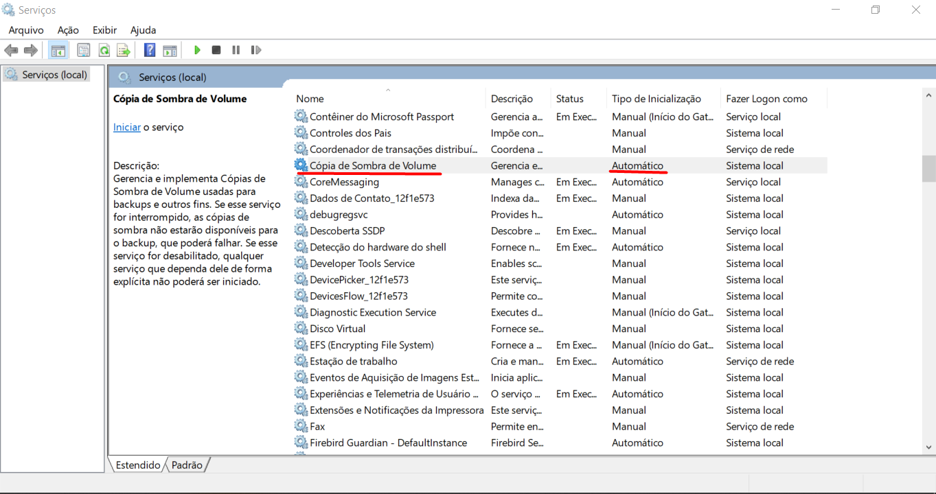1.Veja se o serviço de shadow copy (Cópia de Sombra) está iniciado e em modo de inicialização automático em Serviços do Windows: